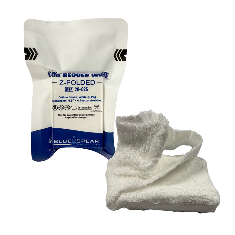 Blue Spear Compressed Gauze is 100% cotton gauze, compact, sterile, high quality utilizing a unique weave, to maximize fluid contact. It is a 6-ply, 4.5” x 4.1 yd. gauze packaged into a compact low-cube finish. The gauze is for the treatment of bleeding, the dressing and bandaging of wounds. The package is a rugged, durable, vacuum sealed container with easy-to-open tear notches. Blue Spear Compressed Gauze is an essential item for every medical kit and can be as backing gauze for hemostatic dressings, for wound bandaging or in conjunction with a compression bandage.
